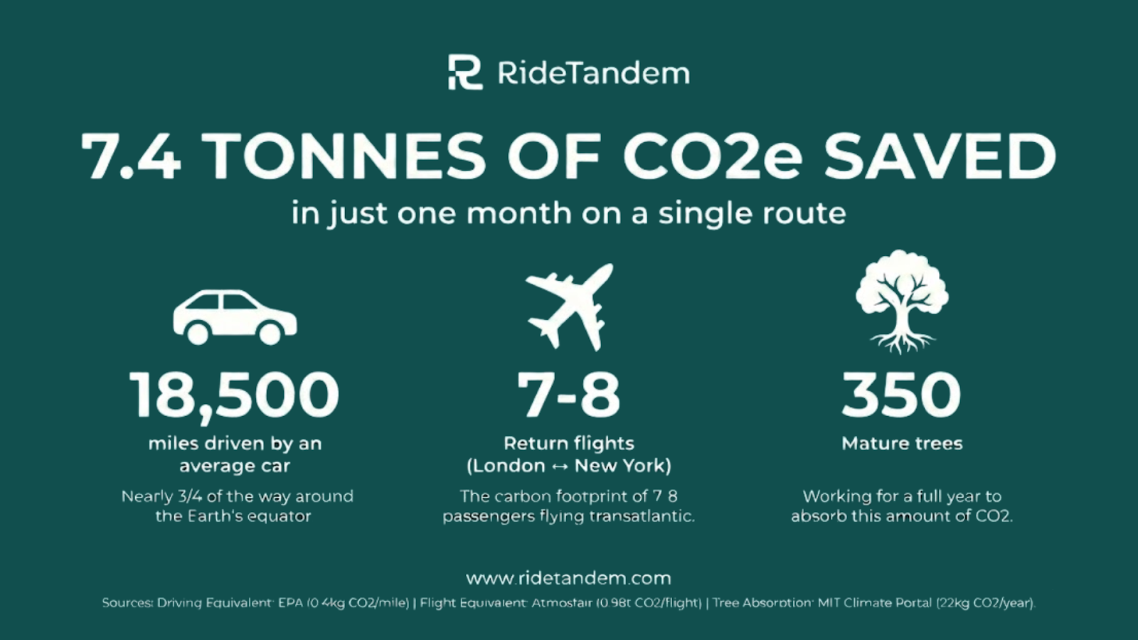 RideTandem reduced costs for GXO by over 56% compared to providing buses directly, helped to avoid over 36 MT of CO2 per month and covered the full cost of the service with passenger fares during the busiest period - making the fully-managed service cost neutral.